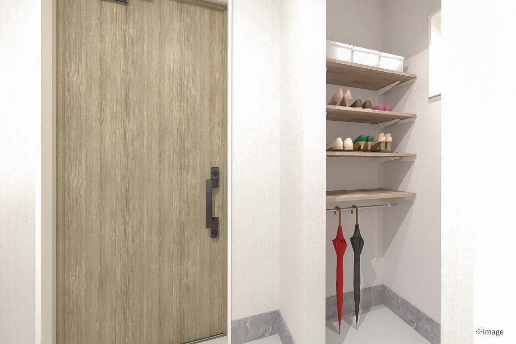 入ってすぐの土間収納は傘やベビーカーなどの収納に便利。お家へのスムーズな出入りを叶えてくれます。